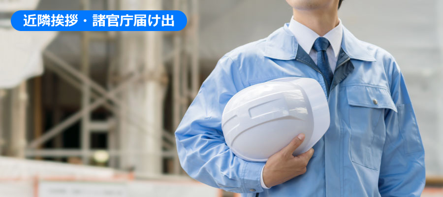 解体工事を行うにあたって、弊社の工事責任者が施工対象物件周辺のご近所様にご挨拶に伺います。また、解体工事に伴う申請など各官庁に必要な手続きへ届け出を代行致します。