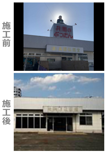 コメント 花壇やポールサイン(支柱)式の看板の撤去とそのしたの基礎の解体撤去、さらに、屋上にある大型のオーナメント(お坊さん)とその土台を撤去するために、大型のクレーンを使用いたしました。地面に下ろした後は重機やガス溶接機などを使って解体、産業廃棄物の種類ごとに選別し、処分業者へ持ち込みました。車両の出入りには十分に配慮し、交通誘導もしっかり行って施工いたしました。