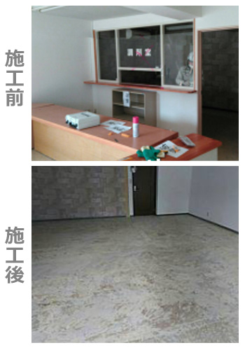 コメント 調剤薬局内部の解体工事のご依頼でした。エアコンやソファなどインテリアの撤去の後、床に貼られたクッションフロア材の剥離に始まり調剤室を構成していたL字壁の解体、天井の撤去、床に貼られたフロアクッション材の剥離、受付台の撤去などを施工させていただきました。さらに、表の看板も撤去させていただきました。